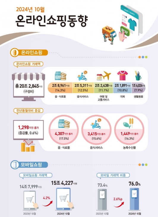 통계청이 2일 발표한 '2024년 10월 온라인쇼핑동향'에 따르면 10월 온라인쇼핑 총 거래액은 20조 2845억원으로 전년 같은 달보다 0.6%(1298억원) 증가했다. 이는 2017년 1월 관련 통계 작성 이래 역대 최저 증가율이다.
